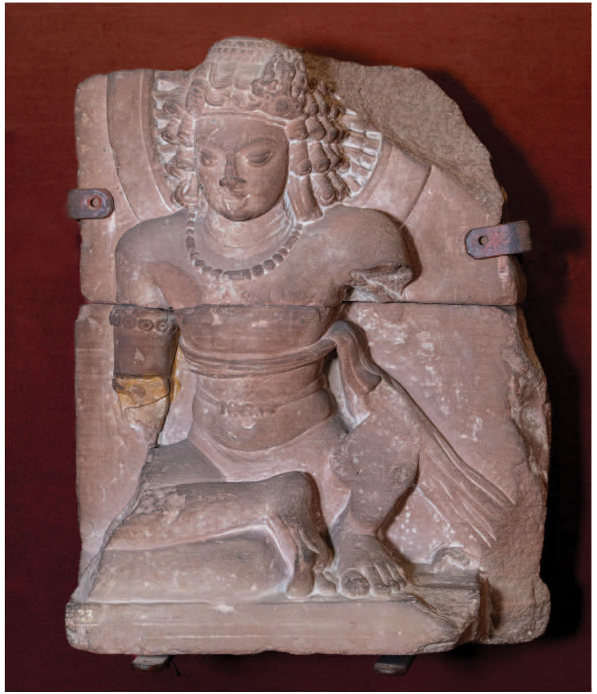 Draped in finery and seated in a position of royal ease, this red sandstone relief shows Gomedha or Kuvera, the first used in Jain iconography and the second in Buddhist, both Indic deities of wealth and lords of male and female nature spirits called yakshas and yakshis. Originating in Vedic literature as minor deities associated with prosperity, they become more recognisable in ancient and pre-modern Indic art, where they personify earthly riches and guardianship over the northern direction. In art across India, these deities are typically depicted as crowned, pot-bellied, dwarflike figures, richly adorned with jewels and seated on lotuses or thrones .. Their key attributes include a money bag or pomegranate symbolising abundance, a club or mace denoting authority, and a mongoose vomitingjewels, signifying triumph over the nagas who are the guardians of treasures. In early sculptures from Mathura (2-4 CE), Kubera appears as a robust yaksha, reinforcing his nature as a fertility and wealth spirit of the forest and earth. In Jain tradition, Gomedha is identified with Sarbahan or Sarvanubhuti, the yaksha attendant of the nineteenth Tirthankara, Mallinatha. While Jainism generally emphasises renunciation, yakshas like Gomedha serve as protectors of the Tirthankaras' images and grantors of material boons to lay devotees. This duality underscores the Jain view that worldly wealth can coexist with pious devotion when directed toward the support of dharma.